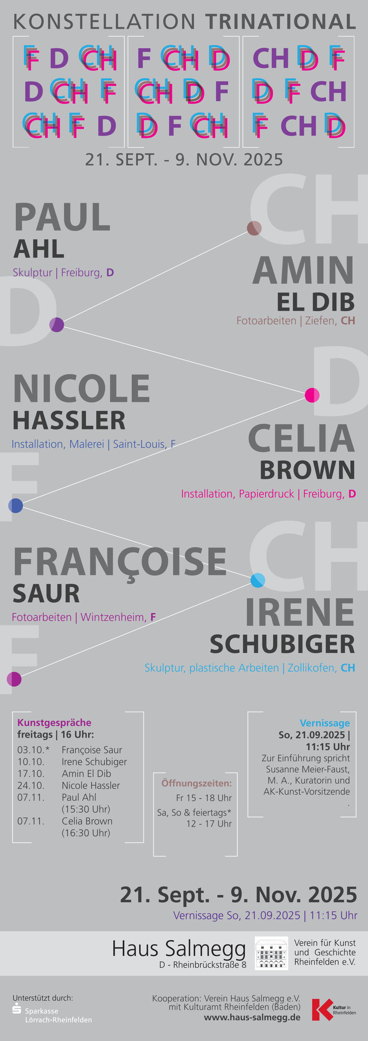 Mit der kommenden Herbstausstellung bringt der Arbeitskreis Kunst die Idee des Dreiländerecks ins Haus Salmegg in Rheinfelden-Baden. Je zwei Kunstschaffende aus Frankreich, Deutschland und der Schweiz stellen sich mit ihren Arbeiten vor: Paul Ahl (D) zeigt plastische Farbarbeiten, Celia Brown (D) stellt Installationen aus Papierdrucken mit naturhaften Ornamenten vor, von Amin El Dib (CH) sind neue Fotoarbeiten, von Nicole Hassler (F) große Wandinstallationen mit Farben aus Kosmetikproduktion zu sehen, die Fotografin Françoise Saur (F) präsentiert klassische Farb- und Schwarzweißarbeiten, die Plastikerin Irene Schubiger (CH) stellt ihre auch experimentellen Arbeiten vor.