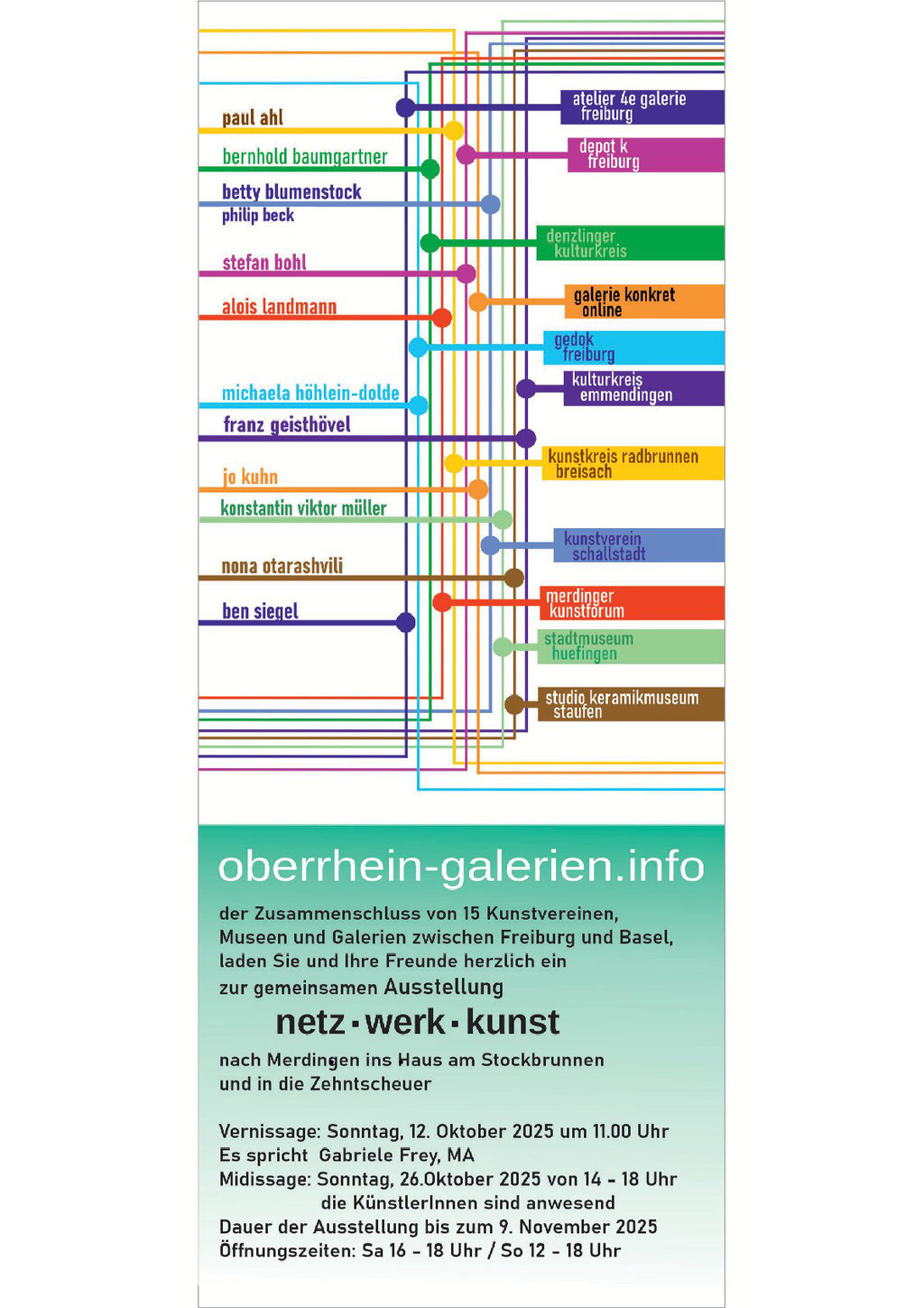 Jeden Freitag (ab 3.10.) findet um 16 Uhr ein Kunstgespräch zur vertieften Begegnung und zum Austausch mit einem/einer Beteiligten statt, siehe Einladungskarte.
