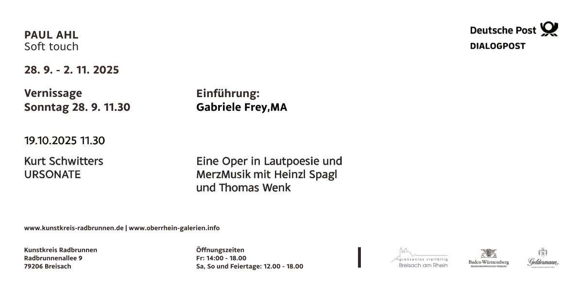 Hier meint Soft touch den Wiedereinstieg für Paul Ahl, die erste Berührung mit seiner künstlerischen Arbeit nach einem halben Jahr Familienpause nach der Geburt seiner Tochter. Sanft sollte der Einstieg sein, doch gleich drei Ausstellungen in zwei Monaten ist eher eine harte Landung. Vor einer Woche im Haus Salmegg in Rheinfelden, am 12. Oktober eröffnet die Ausstellung netz.werk.kunst der Oberrhein Galerien in Merdingen, an der er teilnimmt und heute hier seine Einzelausstellung im Radbrunnen in Breisach.